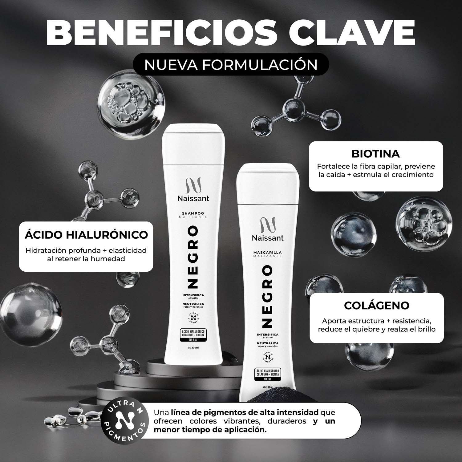 La línea Negro está diseñada para matizar los tonos de tintura negros y castaños muy oscuros.