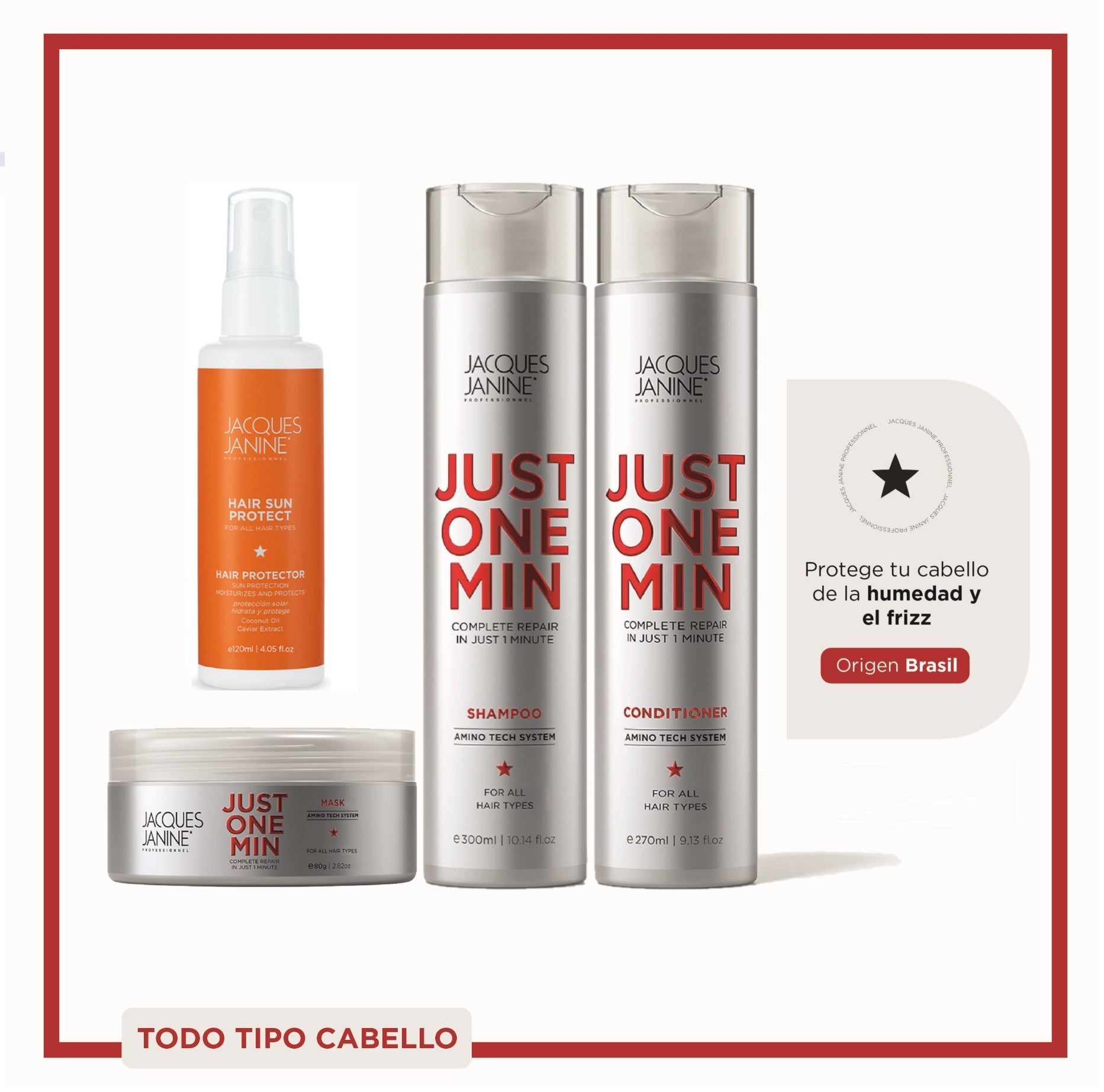 Set Jacques Janine Just One Min – Rutina Capilar de 4 Pasos: Shampoo + Mascarilla + Acondicionador + Protector Solar Capilar